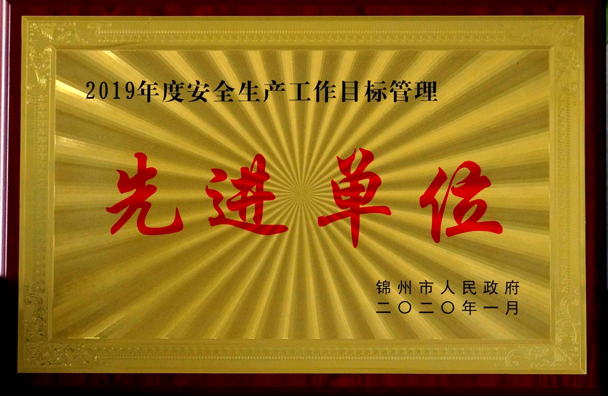 2020年4月,公司被錦州市政府授予“2019年的安全生產(chǎn)工作目標(biāo)管理先進(jìn)單位”榮譽稱號。